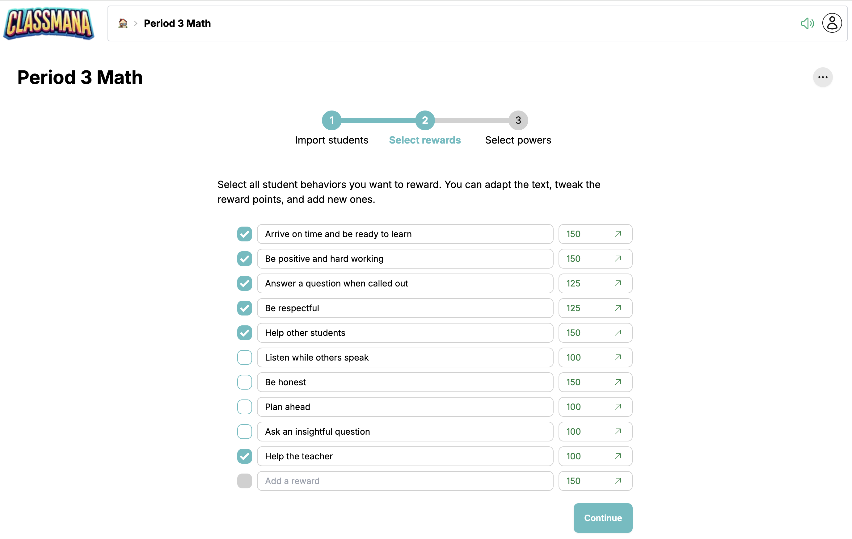 Select the rewards you want to use, customize point values if needed, add your own, then click "Continue".