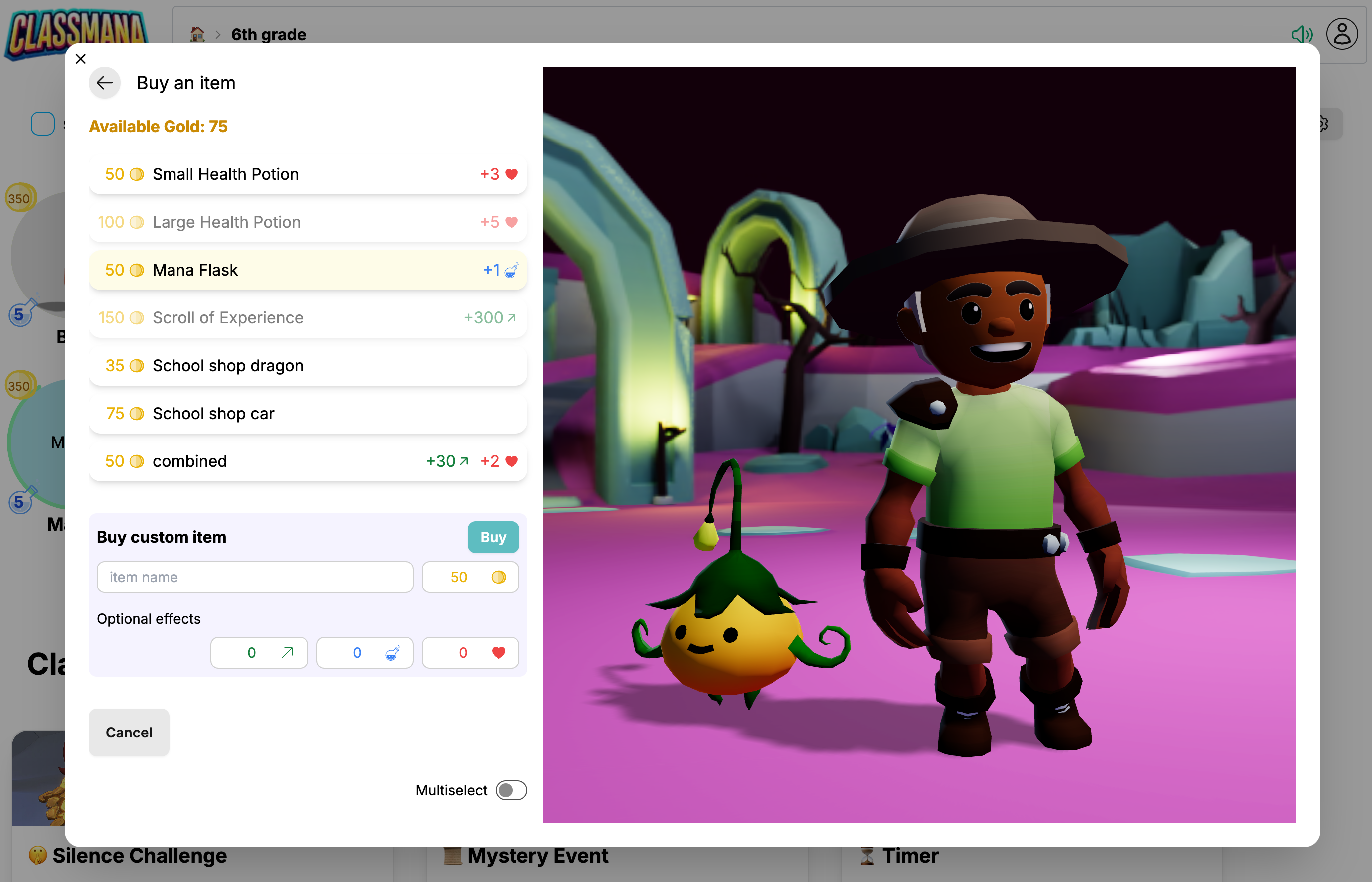 When enabled, students can earn gold with rewards. Students can then spend their gold on shop items. Shop items are either in-game items that give them benefits (like bonus experience or mana), or real-life rewards that you provide.
