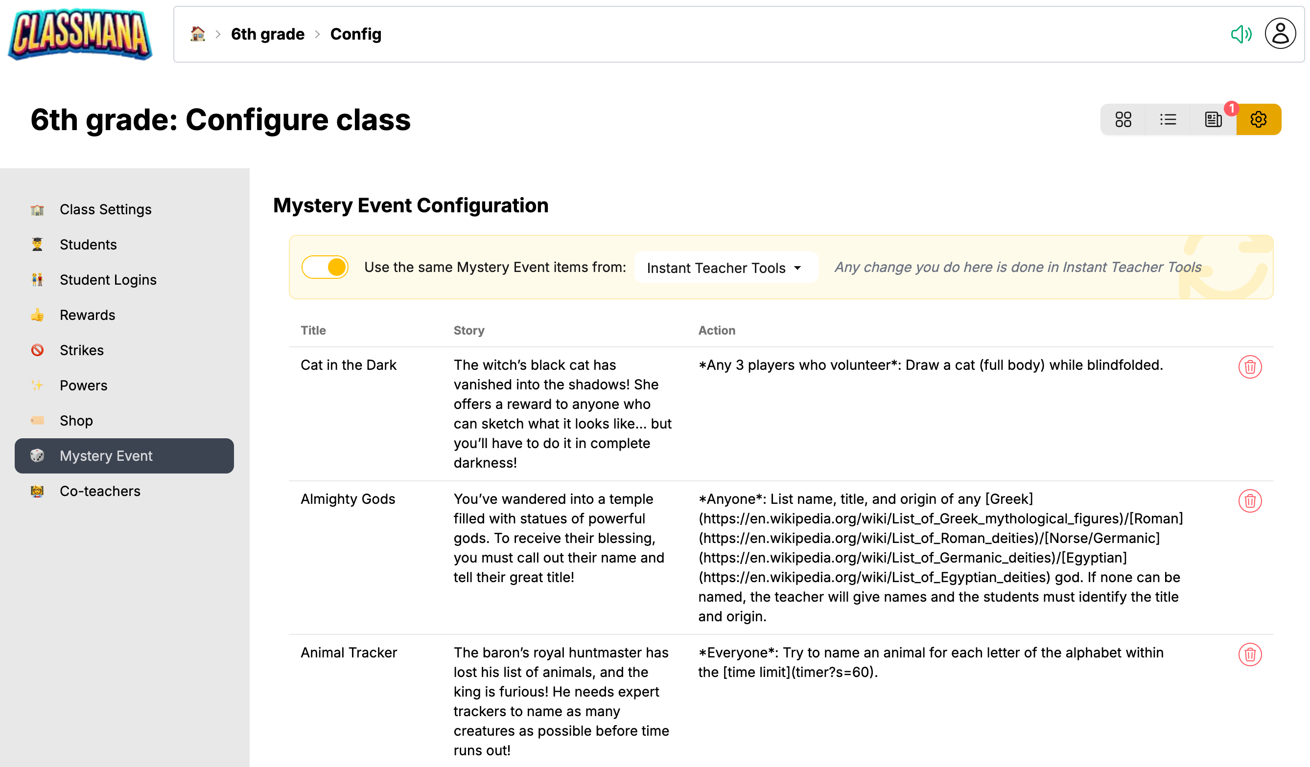 When you have multiple classes, you can sync Mystery Events so they share the same configuration. This saves time — configure once, use everywhere.