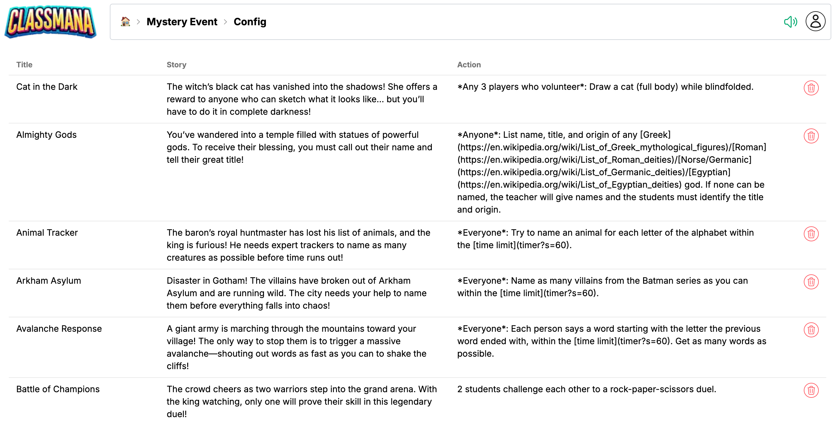 To remove a ClassMana event, click the delete button on its row.
